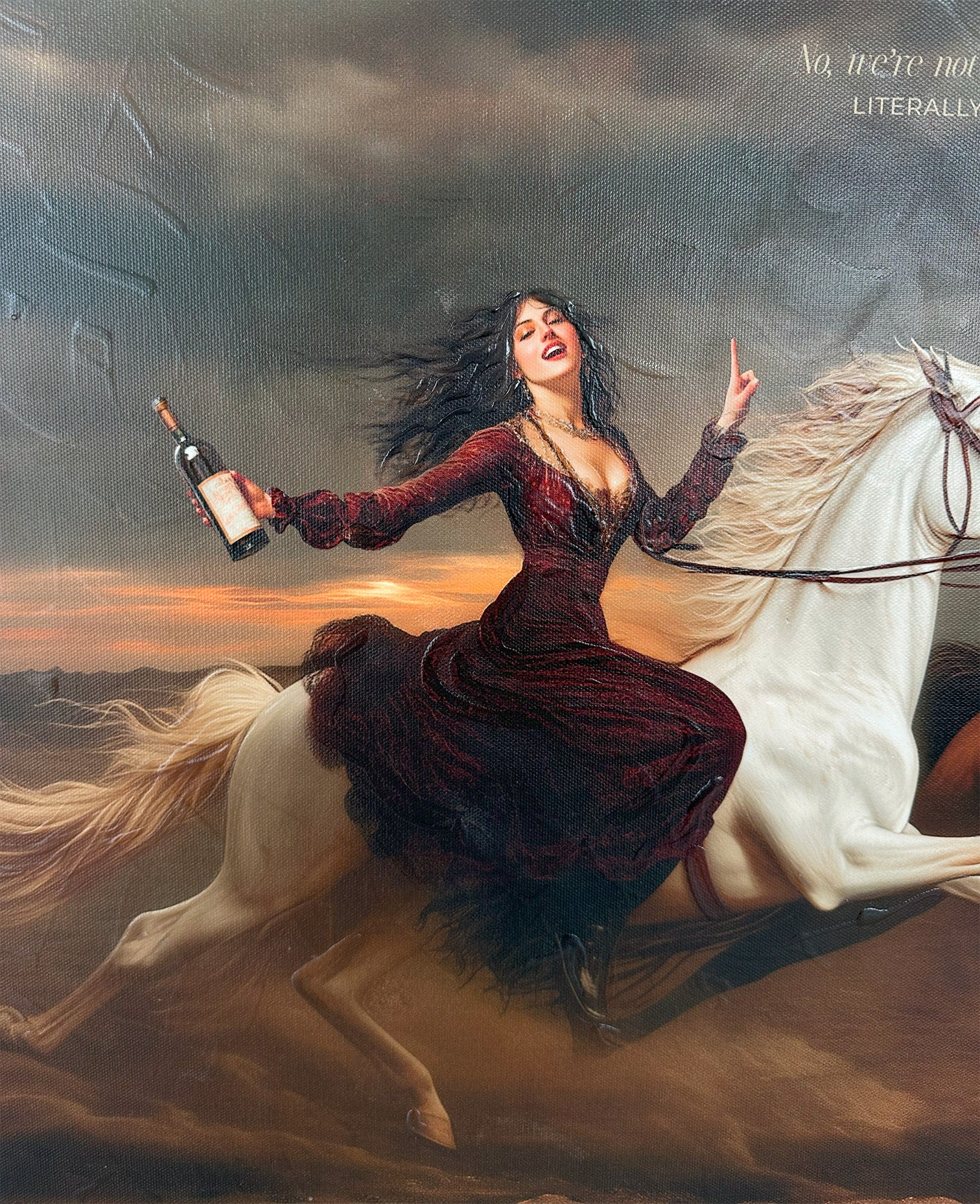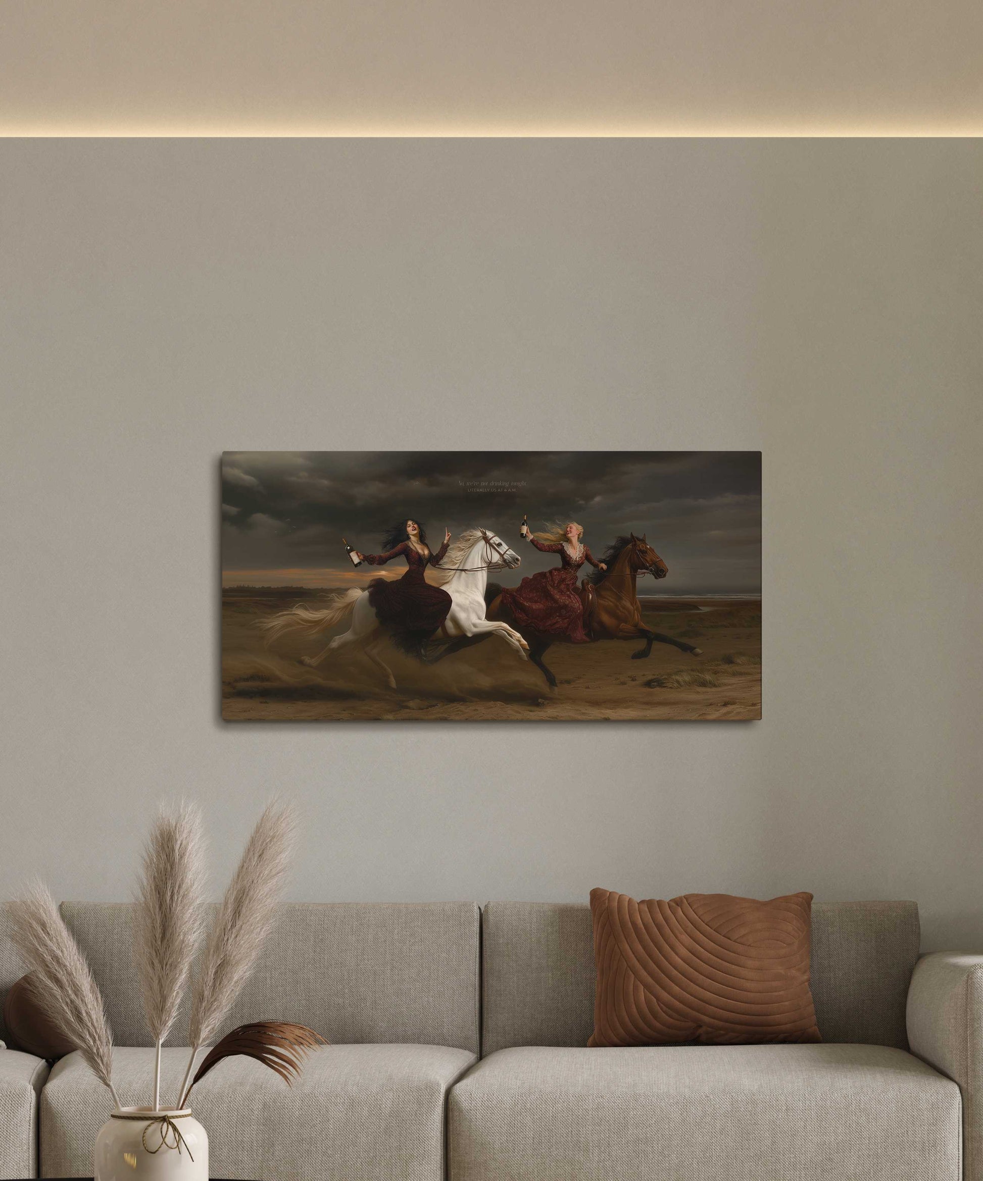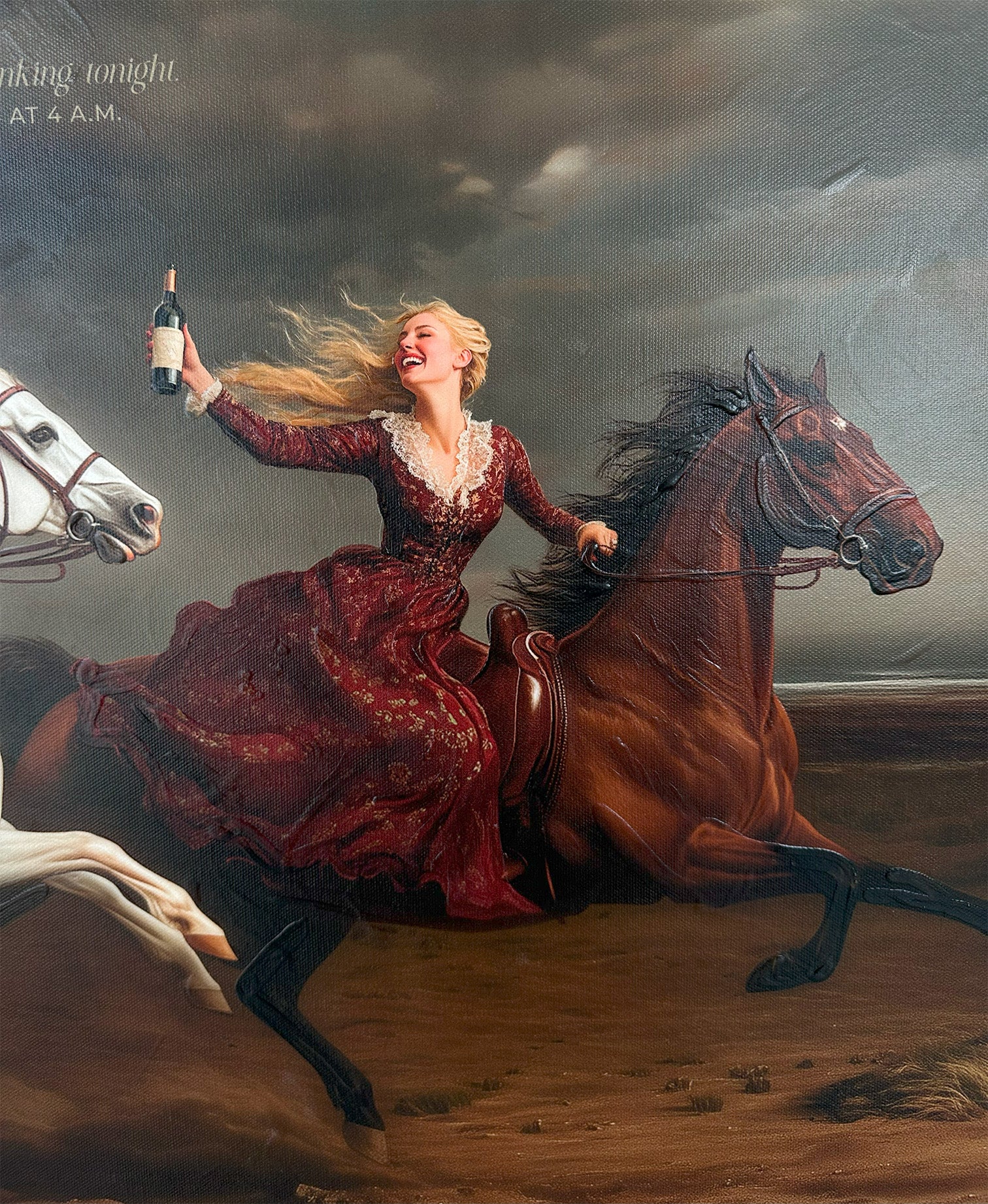 Ride or die w wydaniu „dzikie mustangi o 4 w nocy”: dwie niepowstrzymane furie galopują na koniach, jakby goniły koniec świata! Ściskają butelki wina, jak berło chaosu, ich śmiech tnie noc jak piorun. Wiatr wyje, kopyta miażdżą ziemię, a one? One są ogniem, co spala wszelkie zasady!